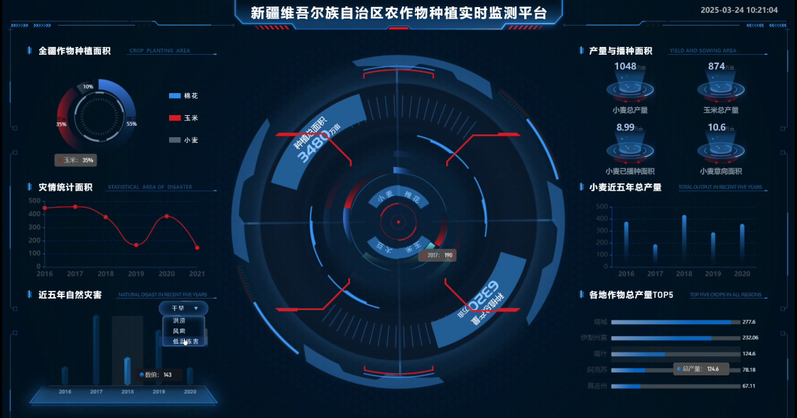 这是新疆维吾尔自治区农作物种植实时监测平台的数据大屏,能够多维度呈现农业相关信息。它可以直观展示棉花、玉米、小麦等全区主要作物的种植面积占比情况,清晰呈现全疆农作物种植总面积以及小麦、玉米等作物的总产量、已播种面积、意向播种面积等产量相关数据;同时,能通过图表展示不同年份灾情统计面积的变化趋势,呈现近五年干旱、洪涝等各类自然灾害的发生情况,还会列出各地作物总产量排名前五的地区,帮助人们全面、及时地了解新疆农作物种植的结构、产量水平以及灾害影响等多方面状况,为农业生产管理、决策等提供数据支持。