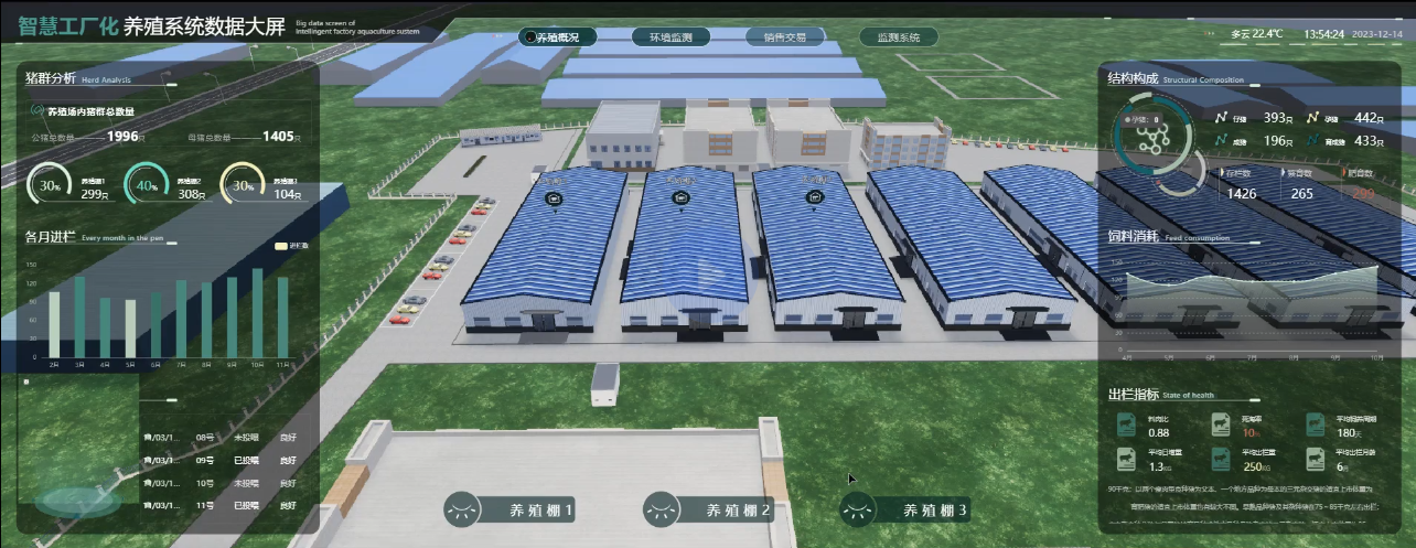 智慧农场产品以数据可视化与 3D 建模为核心,整合养殖全流程数据,大屏直观呈现,助力智能管控、降本增效。