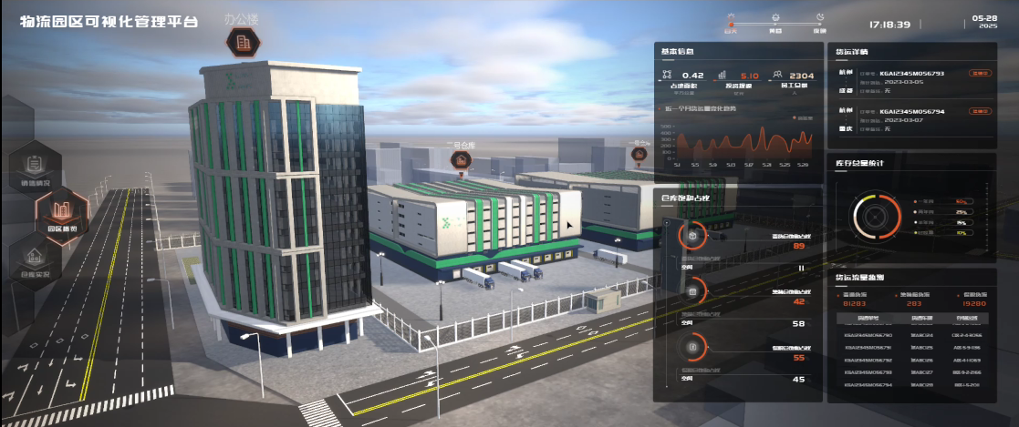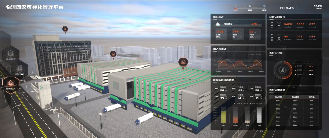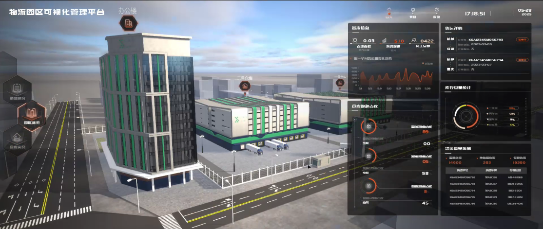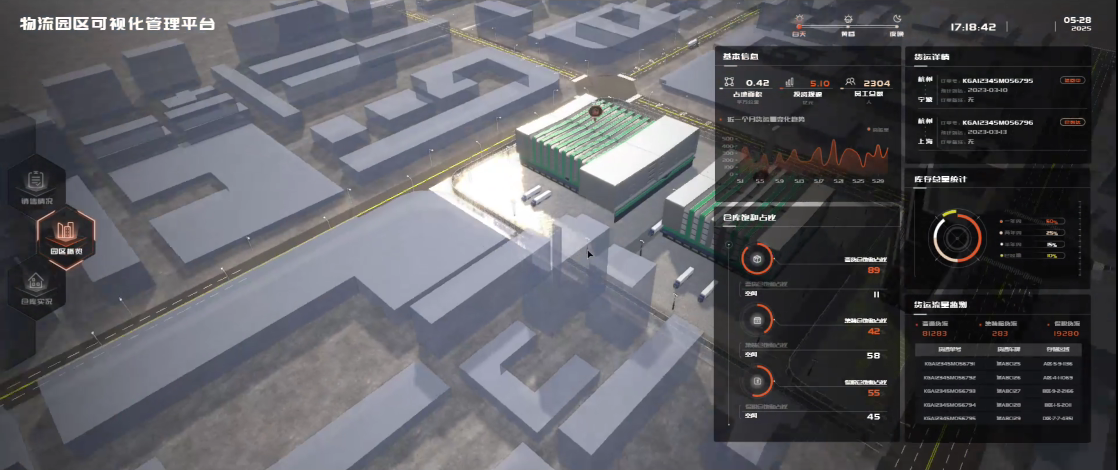通过数字孪生场景实时掌握园区货物存储状态、车辆进出流量、设备运行情况等全域信息,实现全局可视化管控。