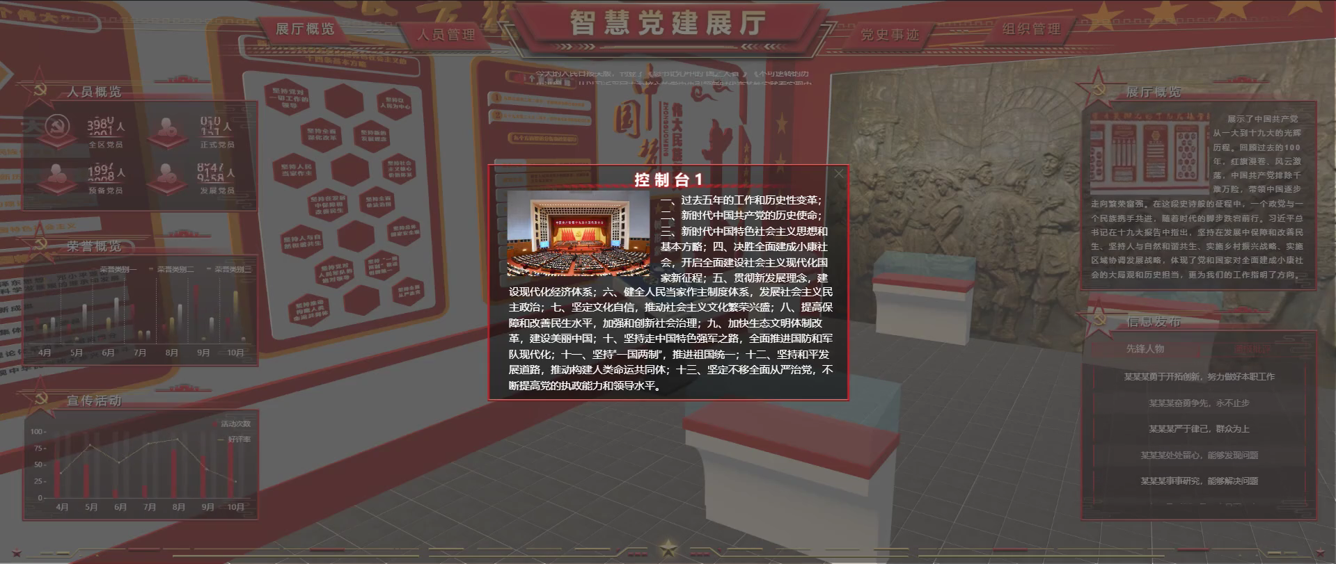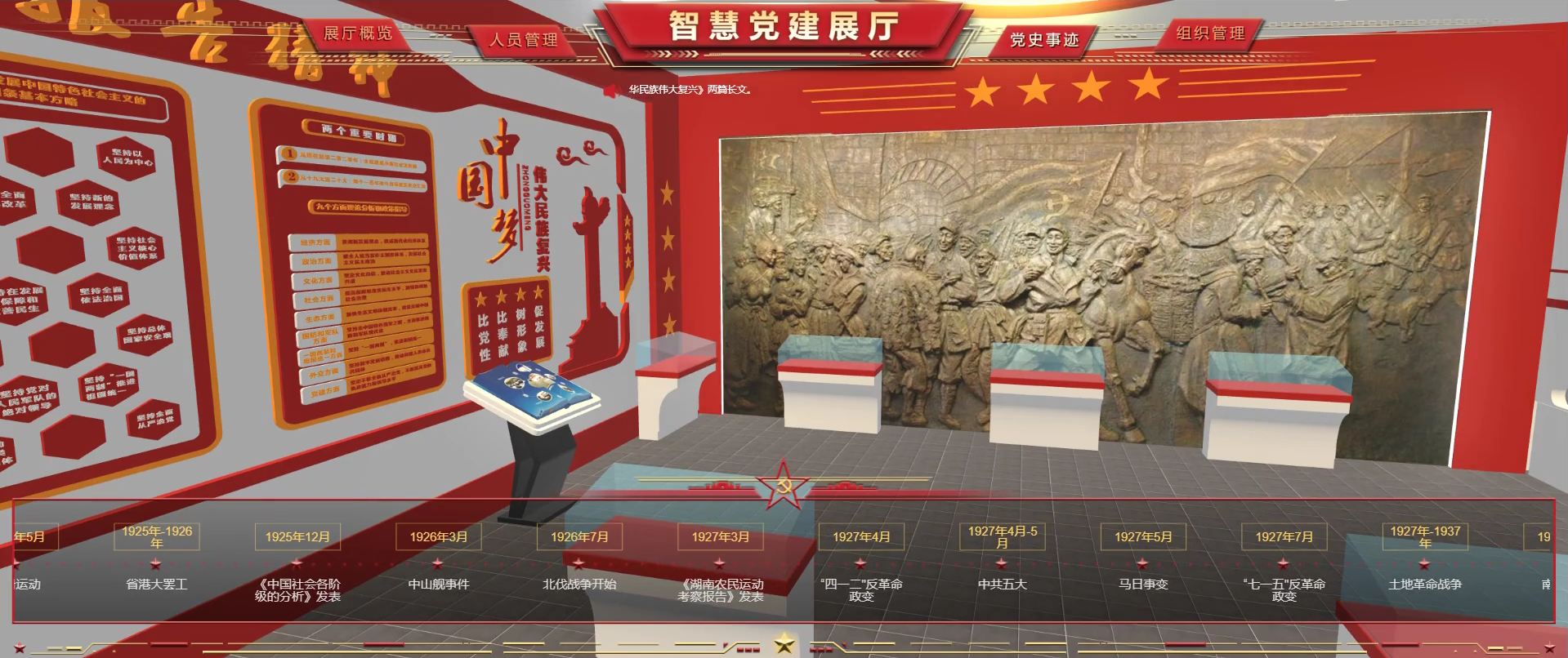 支撑线上线下党建活动落地,通过 3D 可视化场景还原红色教育基地、党建历史事件等内容,丰富党员学习体验,强化党建教育效果。