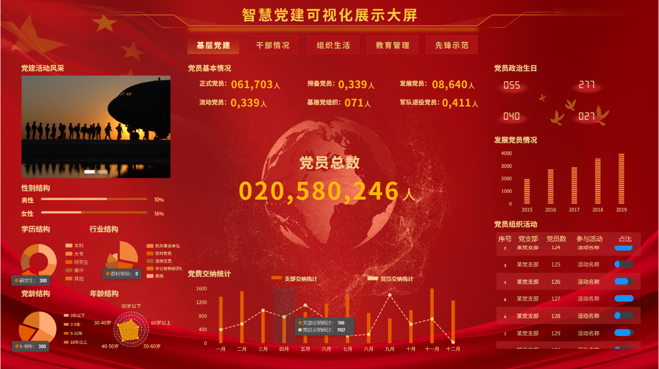 在党建展厅、政务服务中心等场所,通过可视化大屏集中展示党组织架构、党员队伍建设、党建成果等内容,打造沉浸式党建宣传窗口。
