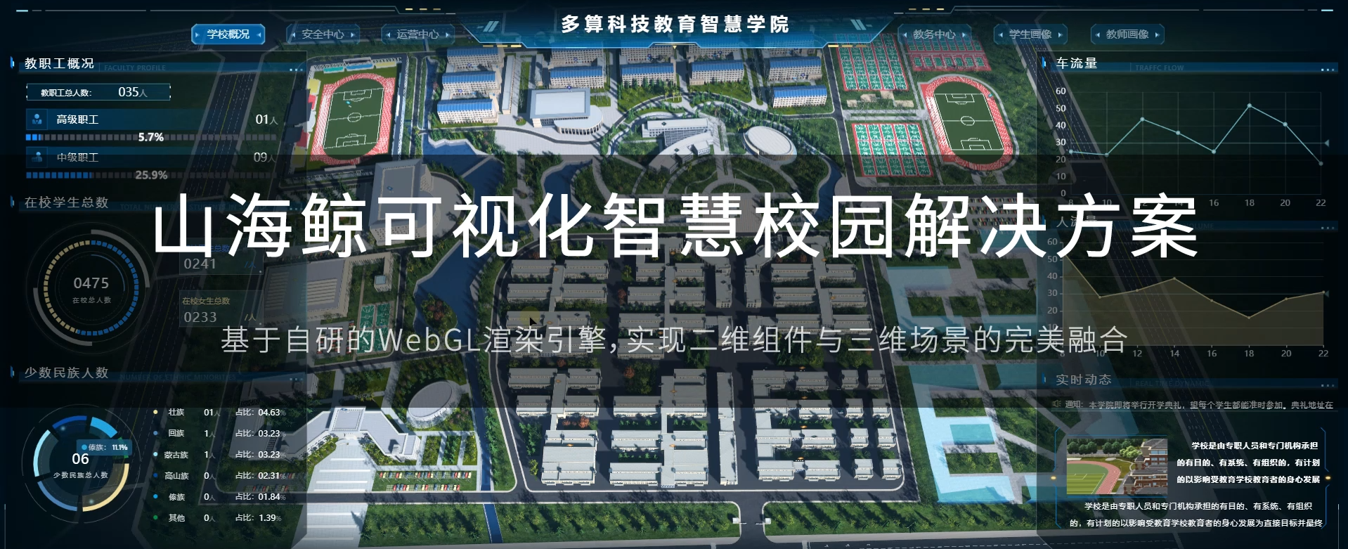智慧校园可视化面向中小学、高校等各学段教育机构的智慧校园可视化解决方案,以数字孪生、3D 可视化、数据可视化为核心技术支撑,整合教学管理、校园运营、安全监测等多维度数据,构建一体化智能大屏平台。